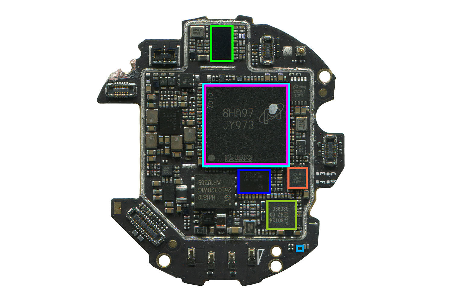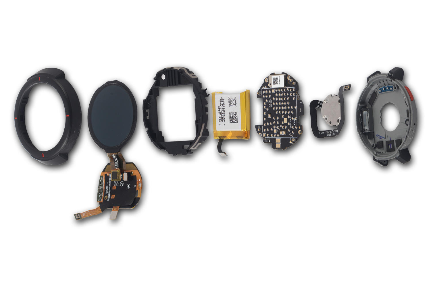 与 Apple Watch Series 4 相比,华米 AMAZFIT 智能手表并没有实时心率监测、防摔检测、SOS 紧急联络等功能,所以在元器件方面,华米 AMAZFIT 智能手表并不需要像 Apple Watch Series 4 那样对检测用的传感器进行模块化处理。