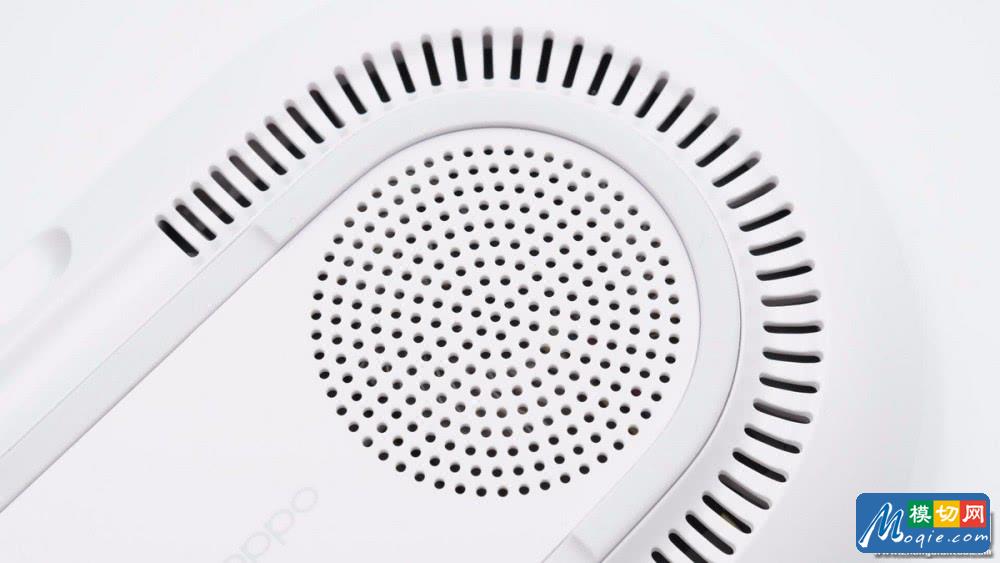 OPPO这款无线充电器采用卧式跑道造型设计,机身圆润扁平,设计简约。整个机身分为左侧风扇和右侧无线充两部分:左侧风扇部分和背面采用白色塑料外壳,表面哑光处理;无线充放置手机位置是深灰色橡胶,并贴有提示贴纸,印有手机正确放置标识。