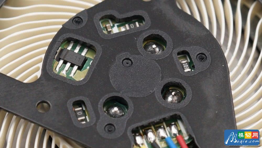 风扇中心区域特写,所有器件和焊盘上方均镂空处理降低厚度,线芯焊点饱满。