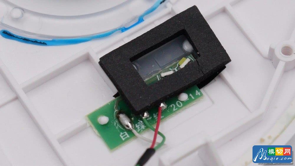 在扇叶下方是一颗白色LED指示灯。指示灯正常工作情况白灯长亮,异常状态下切换到红灯闪烁。