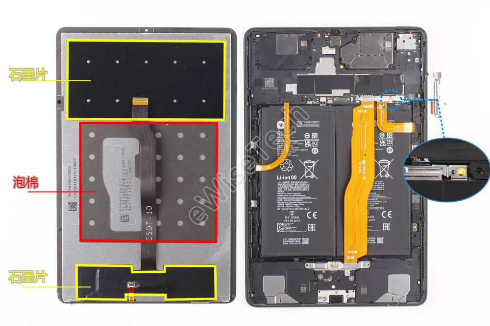 屏幕背面上下两端贴有石墨片,对应顶部主板和底部副板位置。中间对应电池处则贴有泡棉。屏幕排线固定位置处螺丝贴有防拆标签。