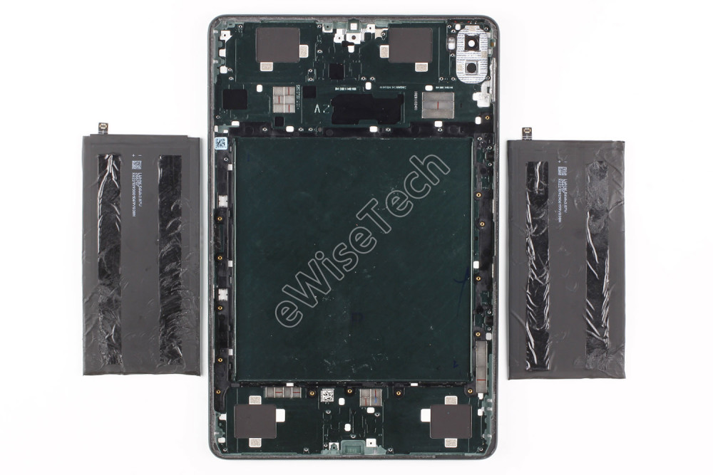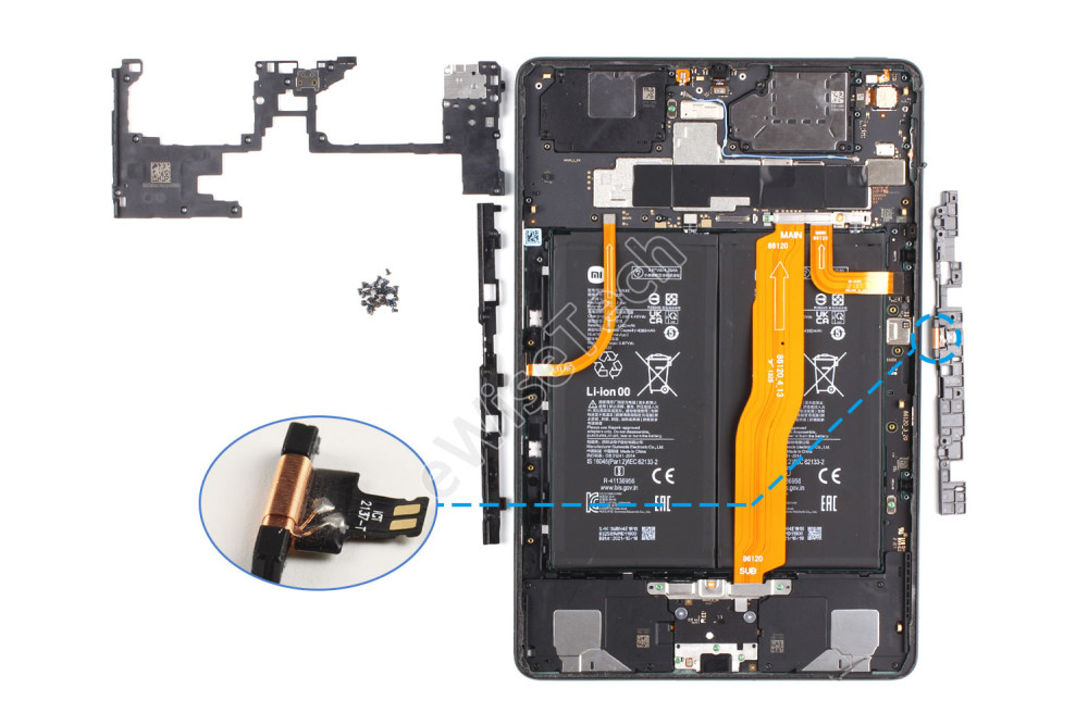 拧下螺丝,取下平板顶部和侧边的3块塑料盖板后,平板的整体布局就一览无余了。平板内的布局是极为相似,顶部+底部各2个扬声器,主板位于顶部或者顶部+侧面,电池居中,副板位于底部。充电线圈模块通过胶固定在塑料盖板上,用于手写笔充电。
