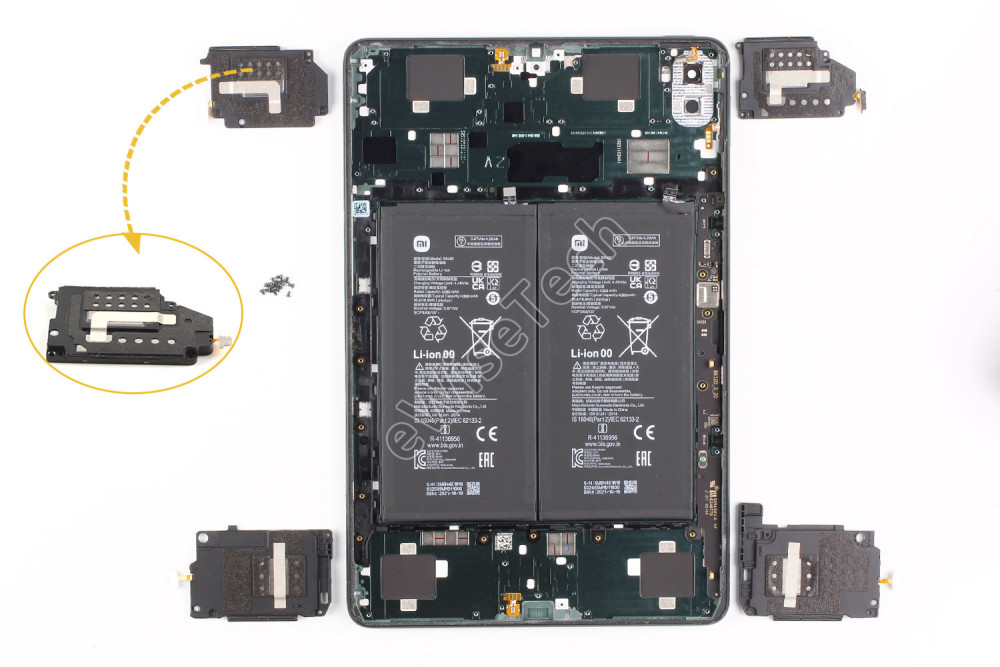 由于扬声器软板触点压在主板和副板下面,因此只有先将主板副板拿掉后才能将取下扬声器。上下共4个扬声器模块都是通过螺丝固定,扬声器供应商为歌尔公司。扬声器背面有黑色泡棉及导电布。