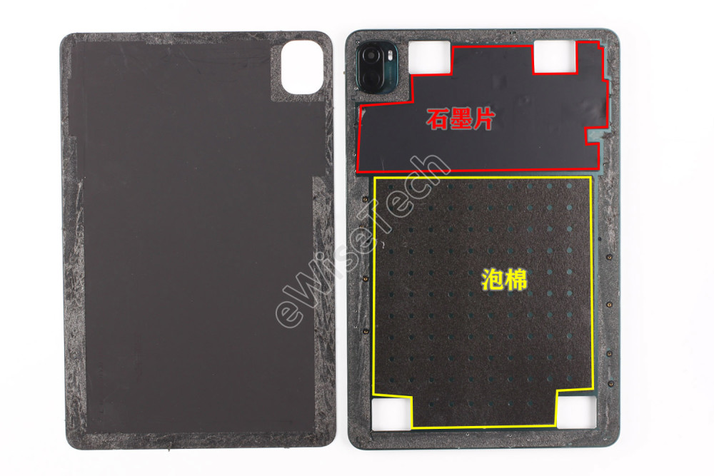 最后加热并分离内支撑和塑料后盖,内支撑背面顶部三分之一部分贴有散热石墨片,剩下三分之二部分则是贴了缓冲泡棉。