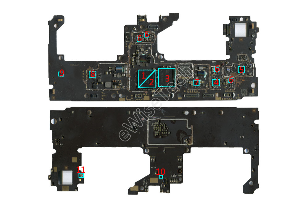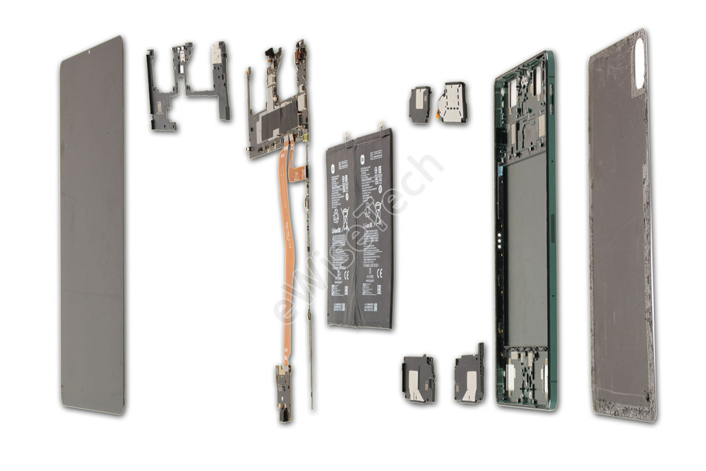 取下上下2根麦克风软板、位于顶部的指纹识别软板、音量键软板和位于侧边的2根感应软板和弹片板。感应软板上集成霍尔传感器。其中麦克风软板和感应软板通过胶固定,指纹识别软板和音量键软板则是卡在内支撑凹槽内,弹片板则是通过螺丝固定。