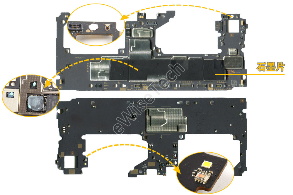 主板屏蔽罩外贴石墨片,内部在有处理器&内存芯片和电源芯片处涂有导热硅脂。主板背面集成1颗后置色温传感器。另外主板上靠近指纹识别模块位置、副板上靠近USB Type-C接口处均贴有进水检测标签,这两处位置是开孔处容易进水。