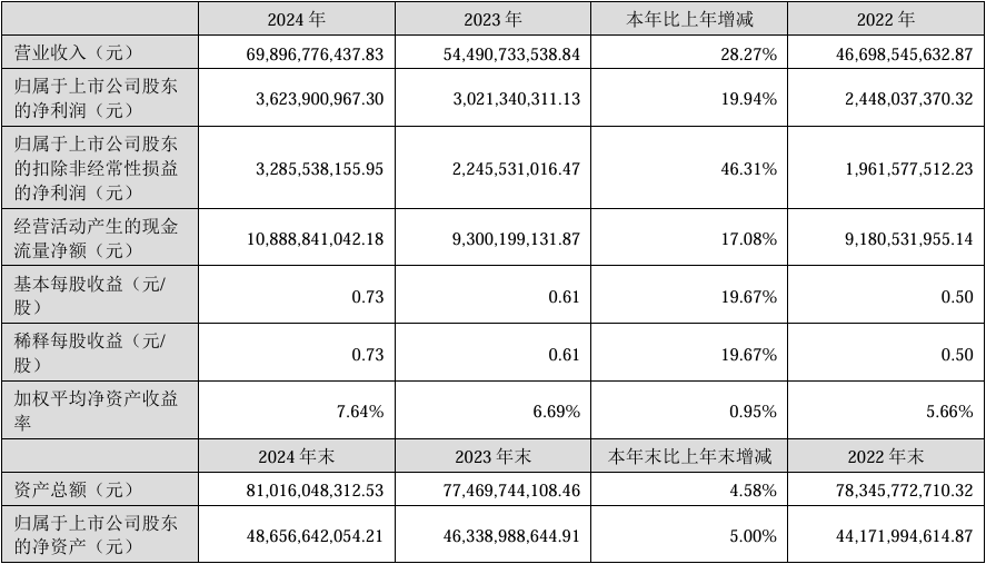 3月28日,蓝思科技发布2024年度业绩报告称,该年度公司实现营业收入698.97亿元,同比增长28.27%;归属于上市公司股东的净利润36.24亿元,同比增长19.94%;基本每股收益0.73元/股,同比增长19.67%;经营活动产生的现金流量净额108.89亿元,同比增长17.08%。