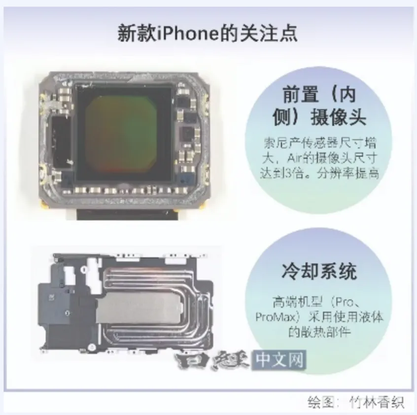新款iPhone还有其他值得关注的点。萤幕顶部的摄像头感测器变大了。感测器由索尼集团制造,为了增强「自拍」功能,提高了解析度。在高端机型中,首次发现了采用液体散热的部件,该部件用于为半导体降温。